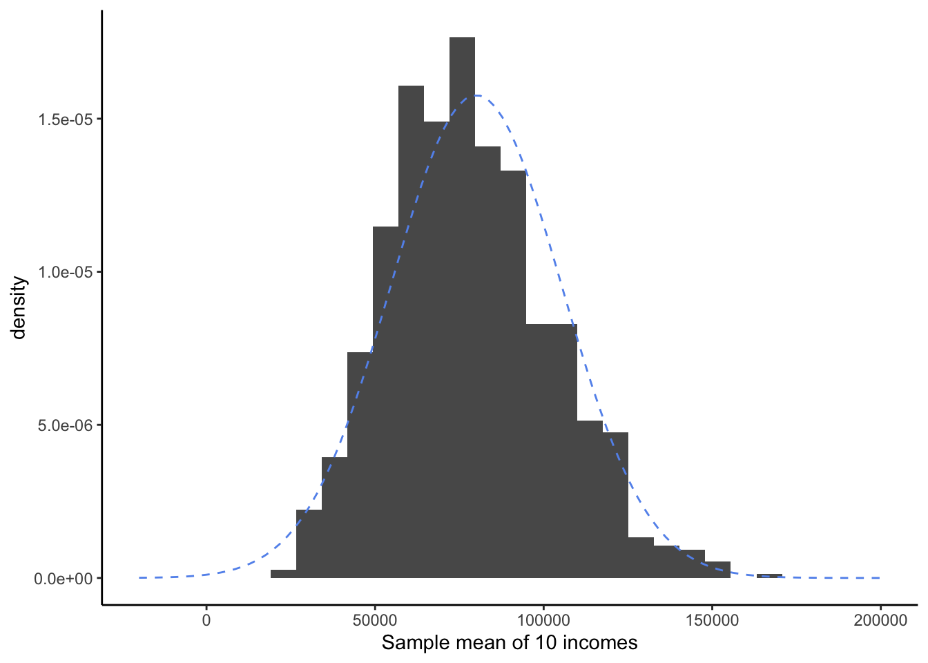 Did the CLT stop working? Of course not! It is simply that three observations is not very many. We still are quite likely to sample, by luck, three very high incomes or three very low incomes.